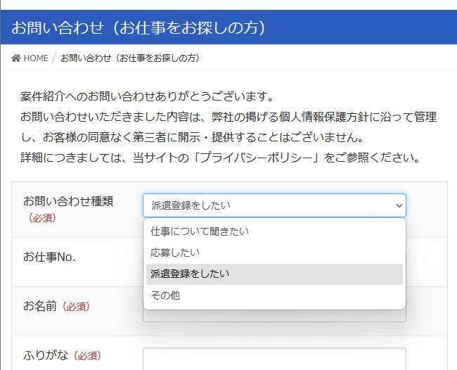 「お問い合わせ種類」から「派遣登録をしたい」を選択いただいたのち、